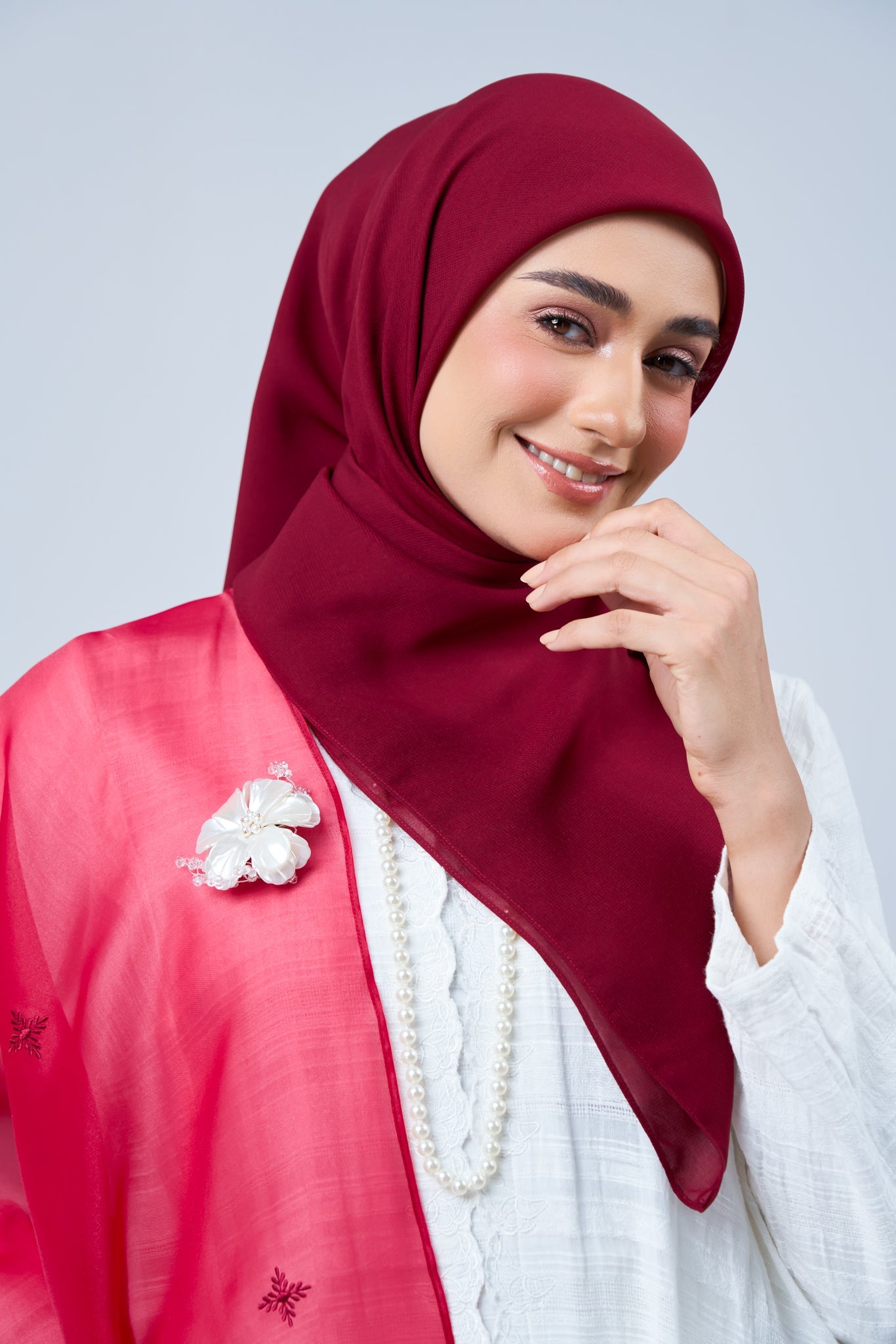 This set features a 46” square voile hijab, beautifully paired with a matching embroidered organza selendang for added grace and versatility.