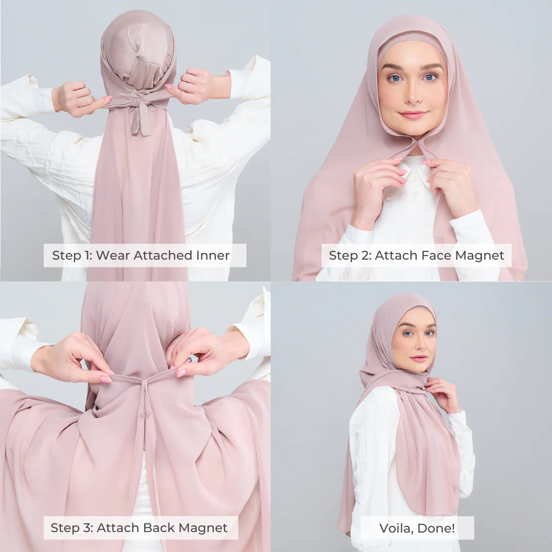 3IN1 Faith features an attached inner to a Full-Curve 1.8 Metre Pearl Chiffon Shawl with Sewn in Front & Back Magnet.