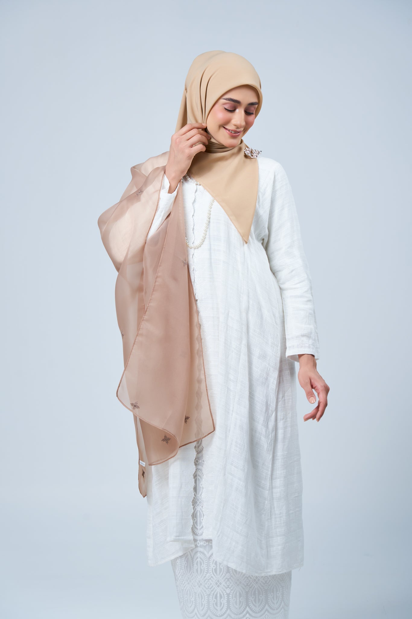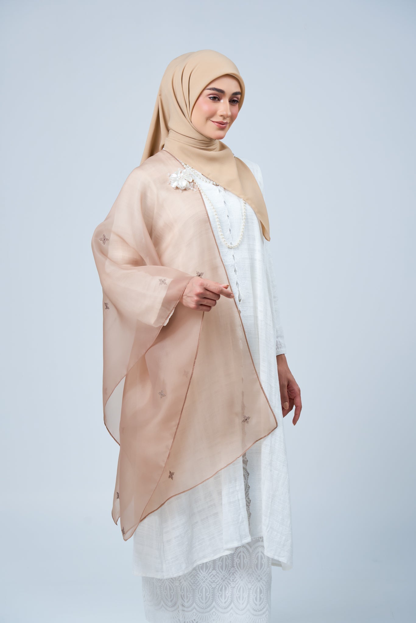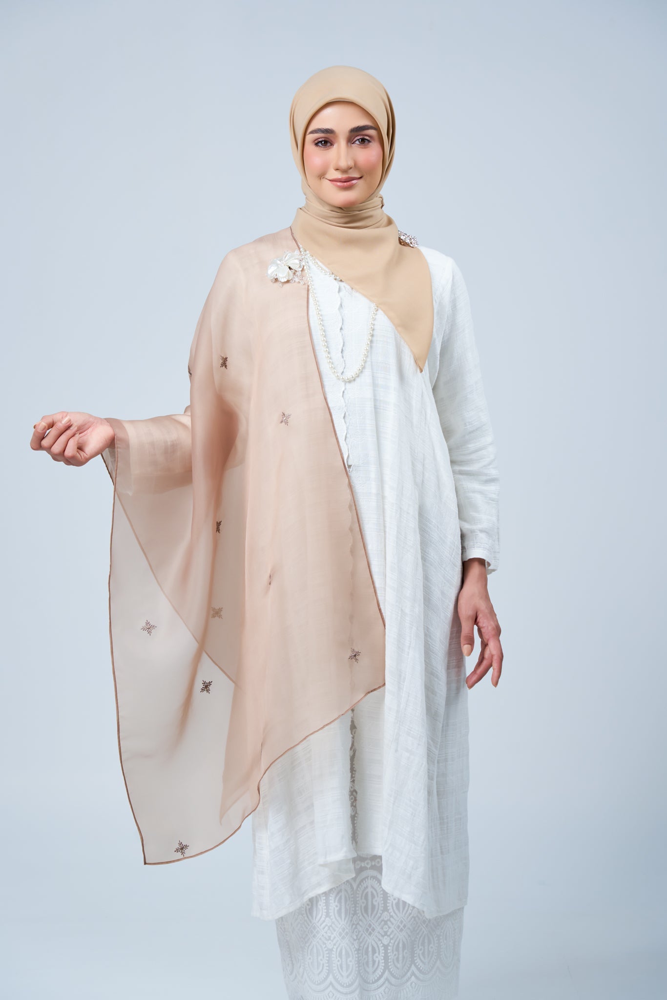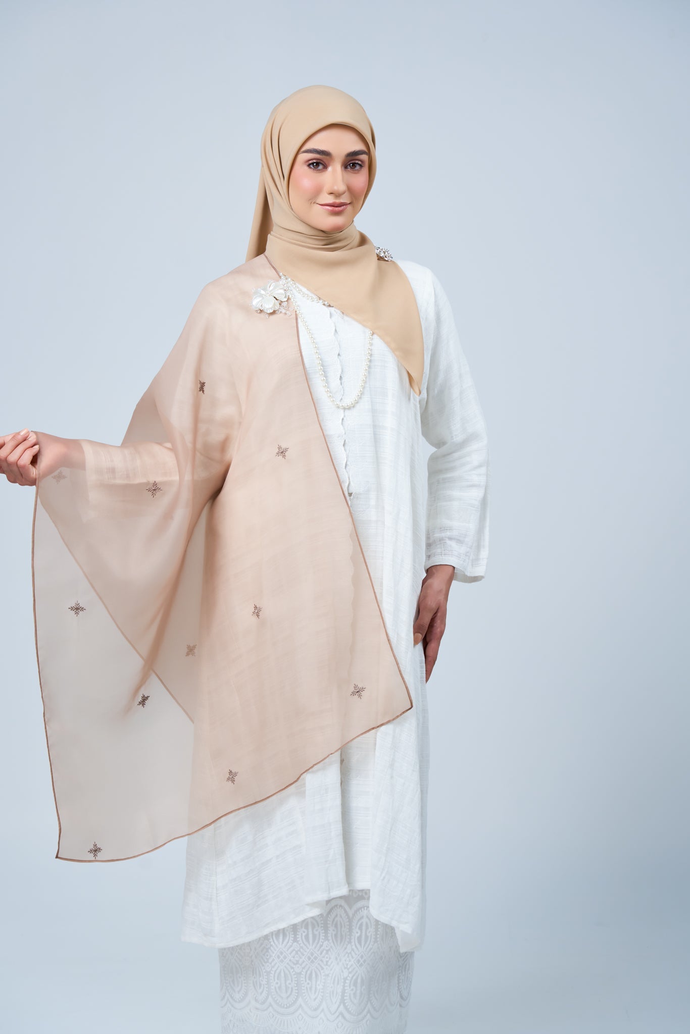 The Rhea Selendang is available for separate purchase, allowing you to pair it effortlessly with your own hijab collection. Crafted from lightweight organza with delicate embroidery, it adds a refined statement without overpowering your look.
